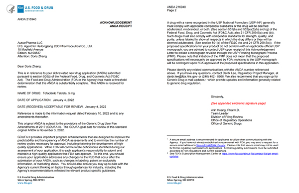 3月16日,珍寶島藥業發布公告,公司化藥仿制藥枸櫞酸托法替布片(規格:5mg)獲得美國食品藥物管理局(以下簡稱“FDA”)下發的《受理通知書》,待取得FDA注冊批件或上市許可批件后可進行銷售。